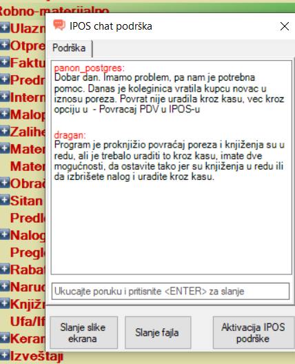 U najnovijoj verziji IPOS-a smo uveli mogućnost pružanja podrške direktno iz IPOS-a putem integrisane chat aplikacije. Klikom na dugme "Podrška" aktivirate chat kojim možete direktno komunicirati sa programerima. Iz chat aplikacije takođe možete poslati sliku ekrana ili aktivirati program za udaljenu podršku...